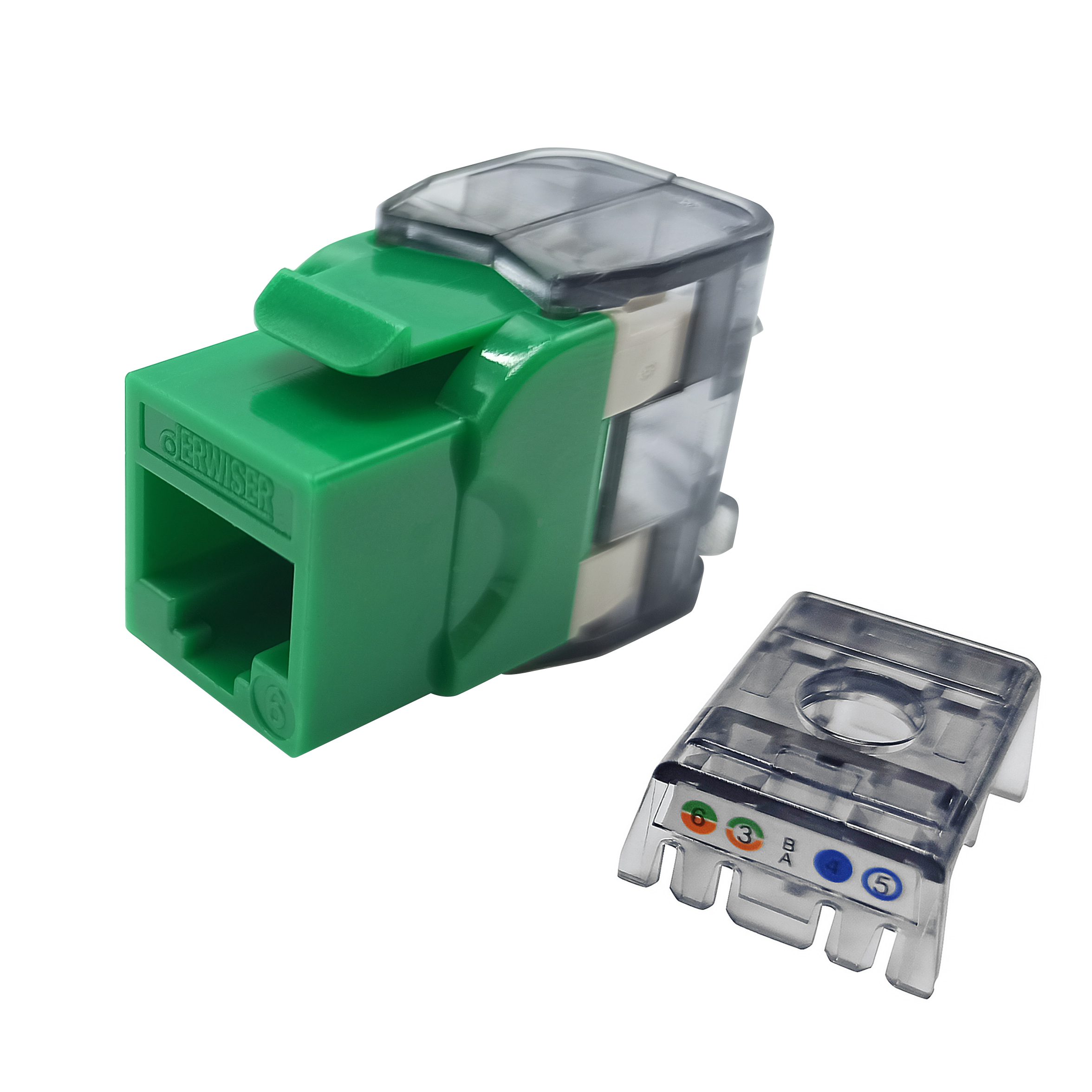 Derwiser CAT 6 Information Outlet is easy to be terminated with punch down and toolless design suitable for 22~26 AWG Stranded and Solid wire, easy for termination, and compliant to T568A and T568B wiring schemes.